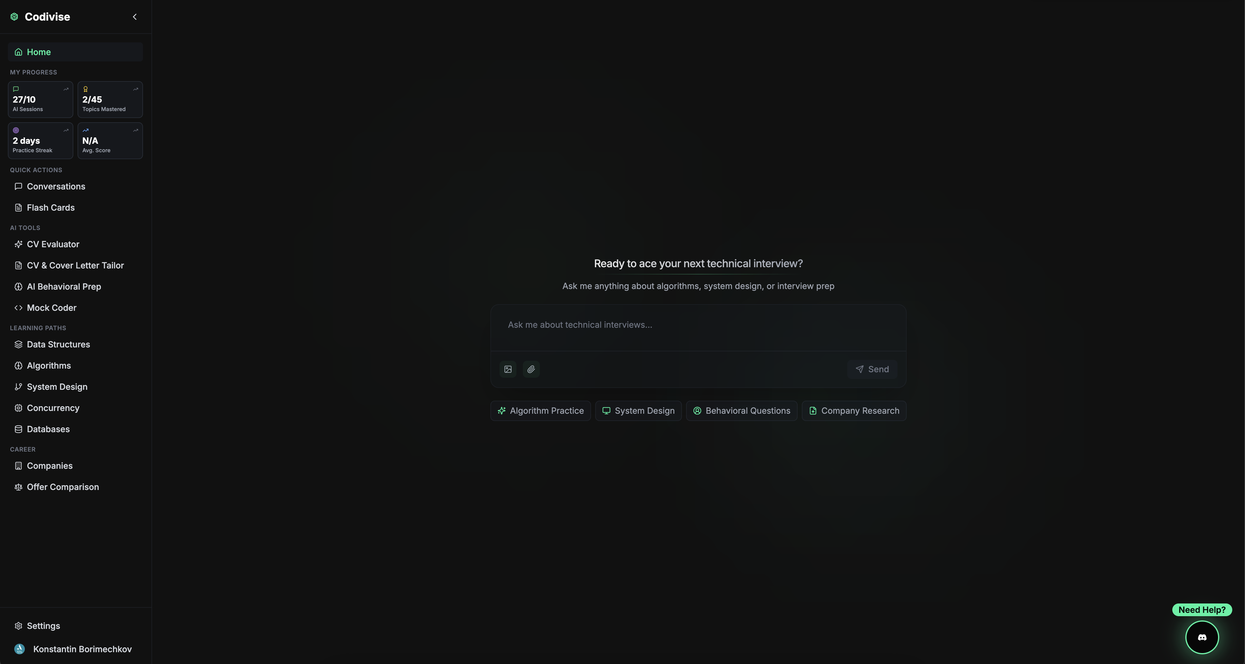 The AI Tutor Chat is Codivise’s conversational learning engine. Powered by an in-house RAG (Retrieval-Augmented Generation) system, it gives you tailored explanations from verified engineering data—not generic web content. Ask anything about technical interviews and get answers that actually help.