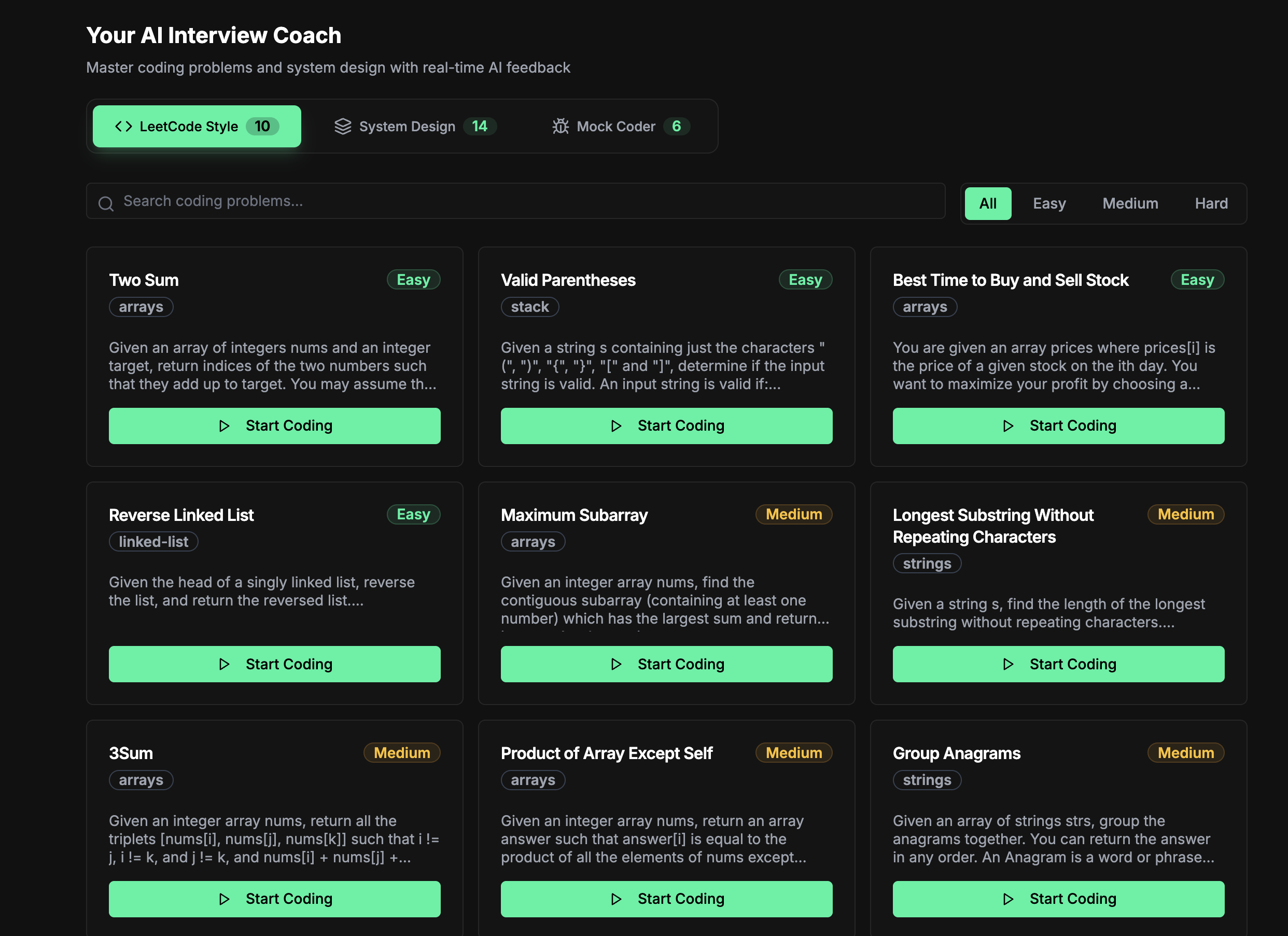 /coding-coach) - Select Algorithms, System Design, or Mock Coder